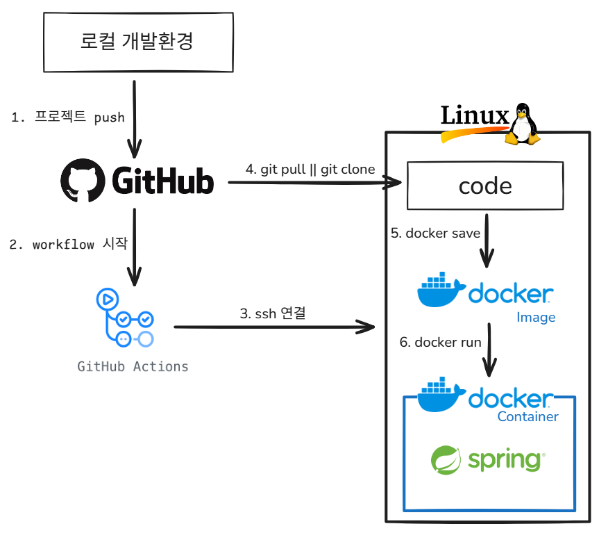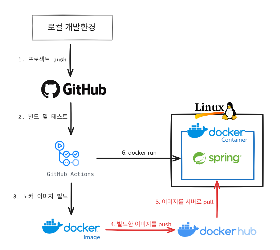 기존에는 `dockerhub`에 이미지를 push / pull 하는 과정이 있었다. (그림에서 빨간색 화살표 부분)