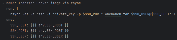 Run rsync -avz -e "ssh -i private_key -p $SSH_PORT" whenwhen.tar $SSH_USER@$SSH_HOST:~/